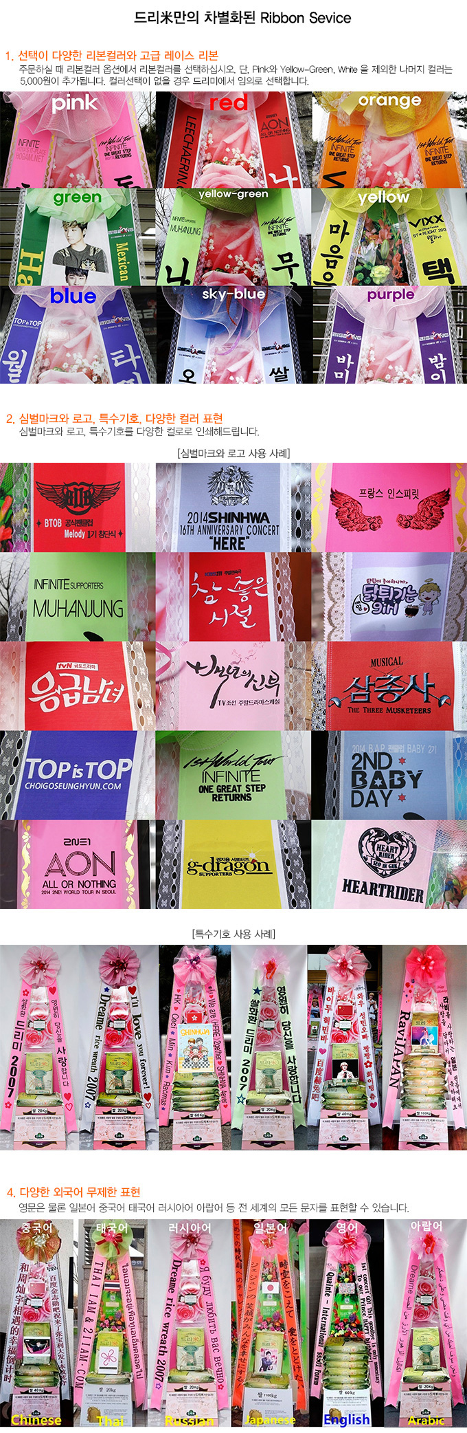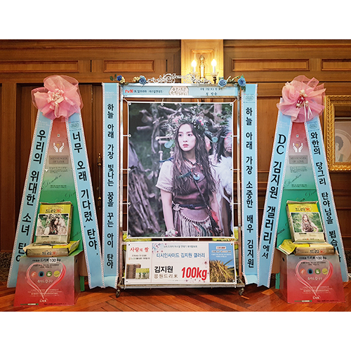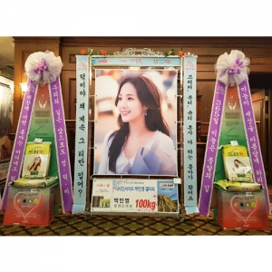 ※ 주문하시는 분의 핸드폰번호와 이메일주소를 반드시 기재하시기 바랍니다. 배송완료문자 및 사진을 보내드립니다. ▶ 상품설명 : 응원메세지와 팬덤매세지 리본, 중형배너가 부착된 드리미 프레임, 드리미 오브제화환 2개에 농협쌀 10kg 10포를 배송합니다. ▶ 상품구성 및 이미지 규격 - 중형배너: 가로110cm X 세로140cm (해상도 최소150dpi / 권장300dpi) - 오브제화환용 A4 이미지 2개 (이미지제작시주의사항)
